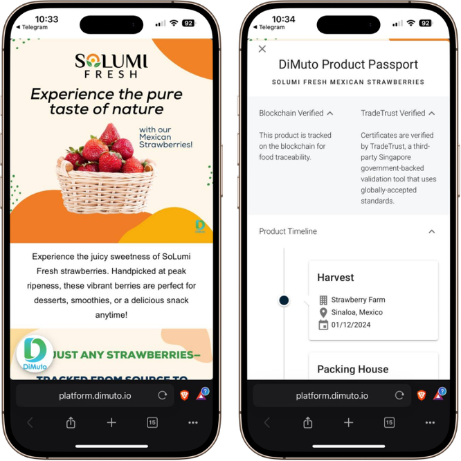 Image of DiMuto’s immutable and verified product passport for SoLumi Fresh strawberries