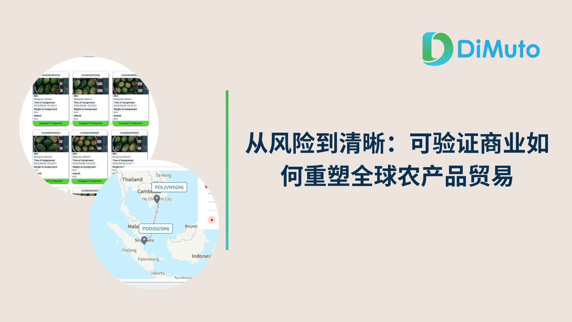 可验证商业 不仅仅是数字化,它是一种对农业贸易运作方式的重新设计,旨在建立一个跨越国界、连接数据、人员和资本的单一可信数据源。通过整合 贸易管理、市场平台和金融服务 的生态系统,DiMuto 降低供应链风险,让每一位参与者都能以更高的可视性、更高的效率和更强的信任开展贸易。